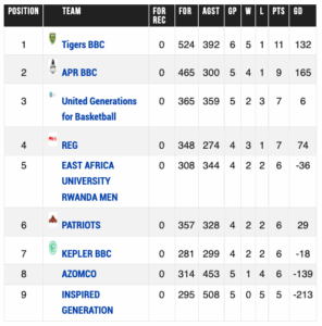 Mbere y’uko imikino yo kuri uyu wa gatatu ikinwa, urutonde rw’agateganyo rwa Shampiyona ruyobowe na Tigers BBC n’amanota 11 (Yatsinze imikino 5, itsindwa 1), APR BBC ni iya kabiri n’amanota 9 (Yatsinze imikino 4, itsindwa 1), UGB ni iya gatatu n’amanota 7 (Yatsinze imikino 2, itsindwa 3), inganya na REG ya kane (Yatsinze imikino 3, itsindwa 1).