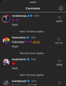 Abarimo Sergio Roberto, Ronald Araujo, Ansu Fati n’abandi bari mu bishimiye intambwe agiye gutera babinyujije muri comments, ndetse na konti ya FC Barcelona nyiyatanzwe.